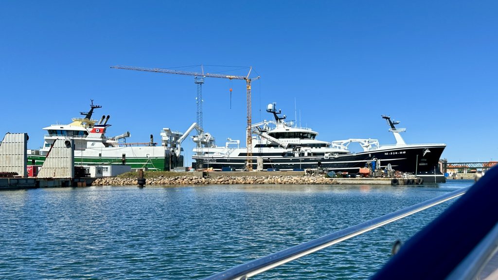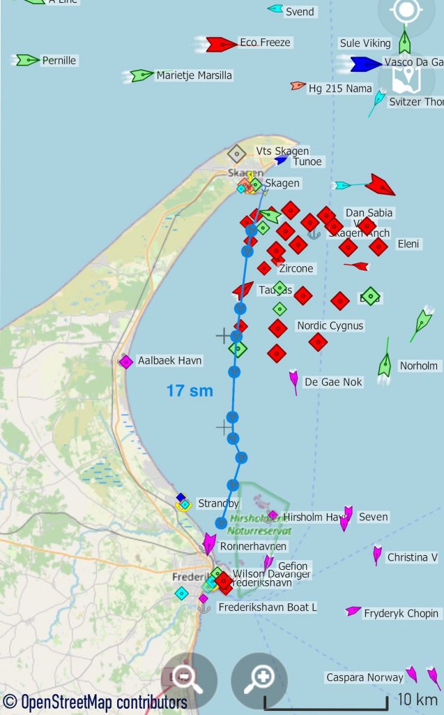 Wie bei jedem Ablegemanöver braucht’s rund eine Stunde, bis unsere Allure wieder komplett startklar ist – heute inklusive Tankstopp. Dann nehmen wir Kurs auf die Reede vor Skagen und schlängeln uns im Slalom durch die eindrucksvolle Armada an vor Anker liegenden Stahlriesen. Beeindruckend, wie viele Ozeanriesen sich hier versammeln.