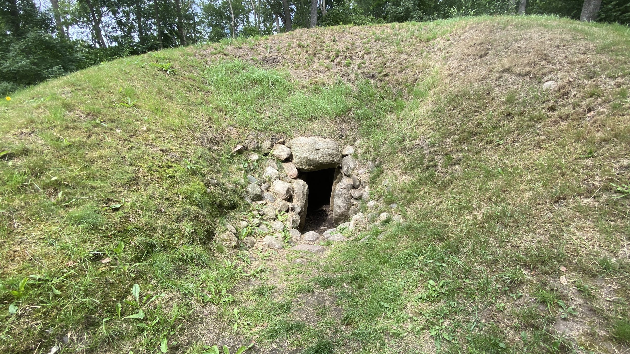 Als der Hügel vor 5000 Jahren in der Steinzeit errichtet wurde, diente er als Gemeinschaftsgrab für die Bauern in der Umgebung. Nach jeder Bestattung wurde der Eingang mit einem flachen Türstein verschlossen und mit runden Feldsteinen abgedichtet. Wollte man die Grabkammer erneut benutzen, so musste man die Kammer aufbrechen.