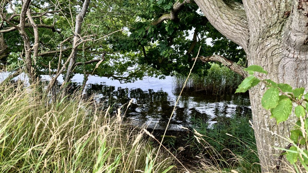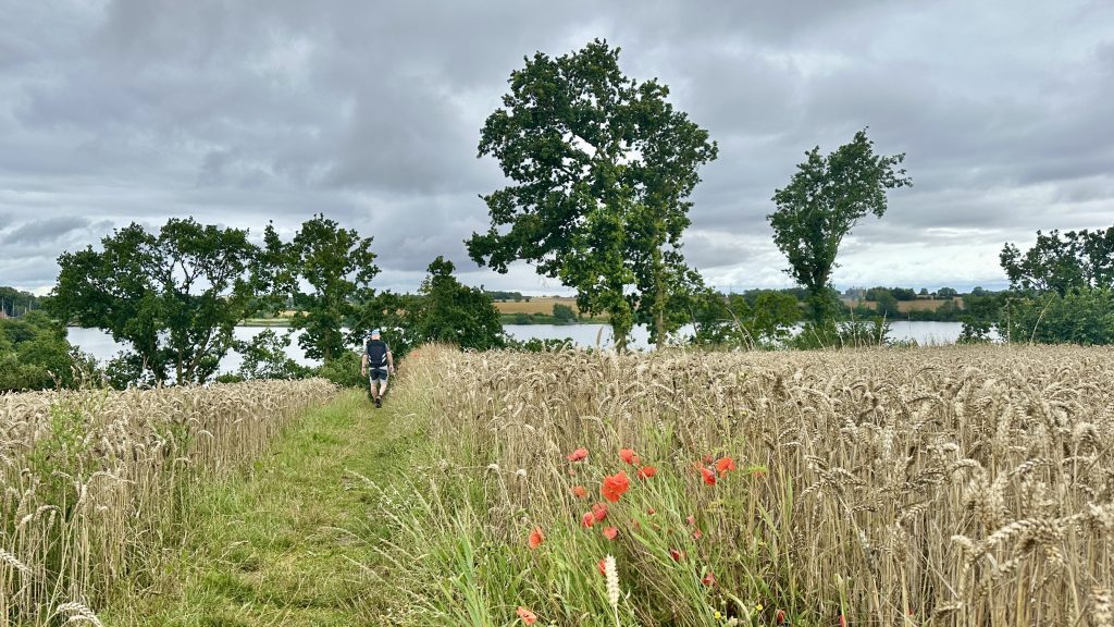 Vormittags schlüpfen wir in die Wanderschuhe und machen uns zu Fuß auf den Weg von Dyvig aus … am idyllischen Oldenor Sø vorbei Richtung Mjels Vig. Der schmale Wanderpfad (Alsstien) schlängelt sich durch Kornfelder unmittelbar an der Bucht entlang.
