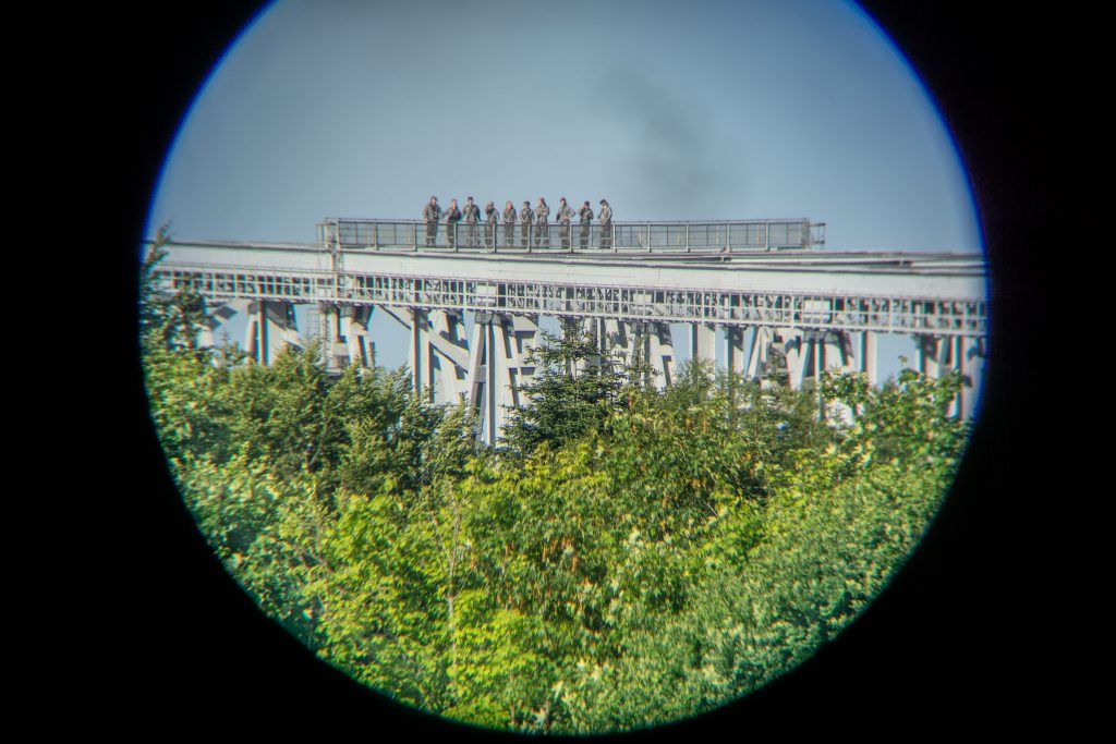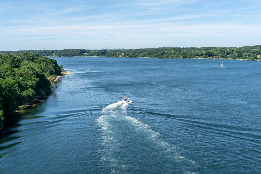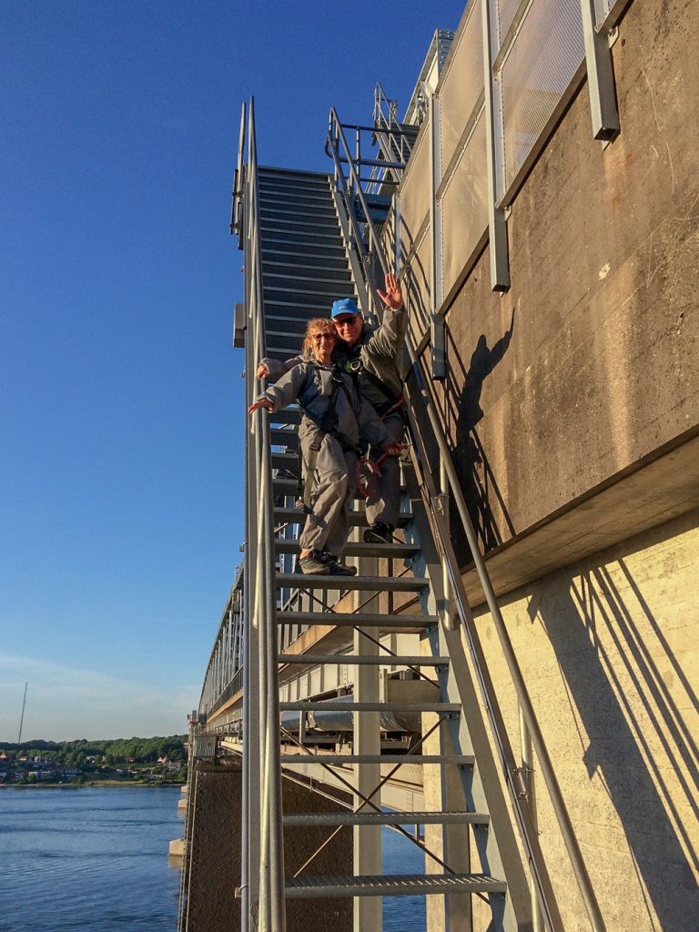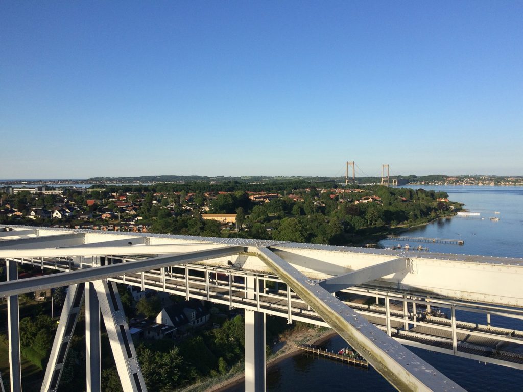 In unserer gebuchten Abendtour klettern wir gut gesichert ganz oben auf der alten Eisenbahnbrücke über den ‚Kleinen Belt‘ – zwar ’nur‘ in 60 Meter Höhe, aber immerhin! Wir spüren die leichte Brise, die Vibrationen, wenn ein Zug unter uns durchrauscht und genießen die fantastische Aussicht in schwindelnder Höhe.