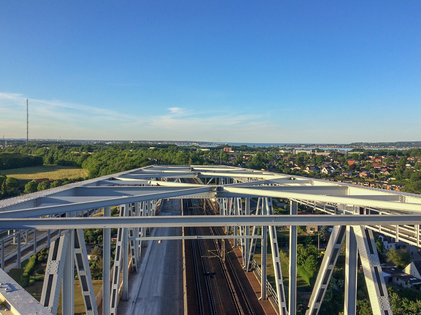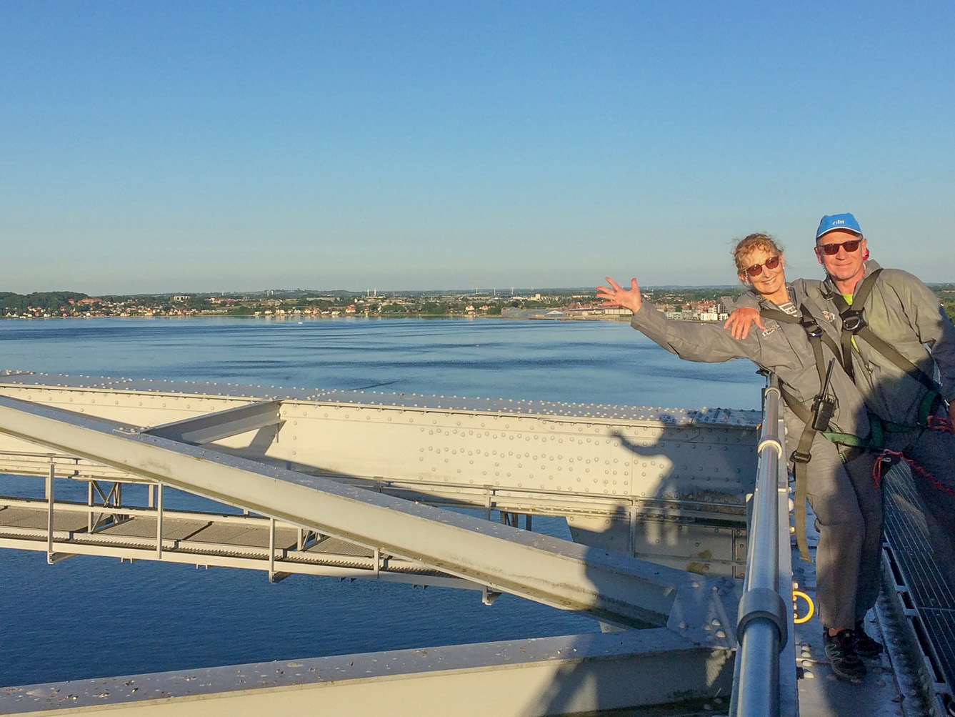 In unserer gebuchten Abendtour klettern wir gut gesichert ganz oben auf der alten Eisenbahnbrücke über den ‚Kleinen Belt‘ – zwar ’nur‘ in 60 Meter Höhe, aber immerhin! Wir spüren die leichte Brise, die Vibrationen, wenn ein Zug unter uns durchrauscht und genießen die fantastische Aussicht in schwindelnder Höhe.