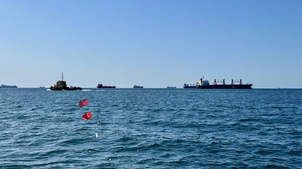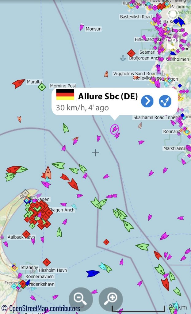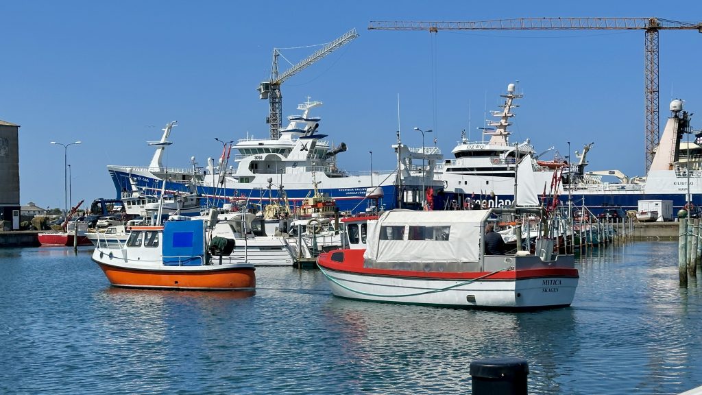 Auffällig: Vor Skagen liegen Frachter, Tanker, Containerriesen wie auf einer Perlenschnur auf Reede und dann auch noch Fischerfähnchen!