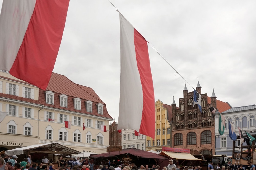 Auch ohne dieses Volksfest würde die Stadt Stralsund einen tollen Eindruck bei uns hinterlassen. Viele schmale Gassen und Sträßchen, der Marktplatz mit seinem filigranen gotischen Rathaus (zur Zeit leider eingerüstet, schade) und die vielen bunten Bürgerhäuser, die wie Theaterkulissen ausschauen.