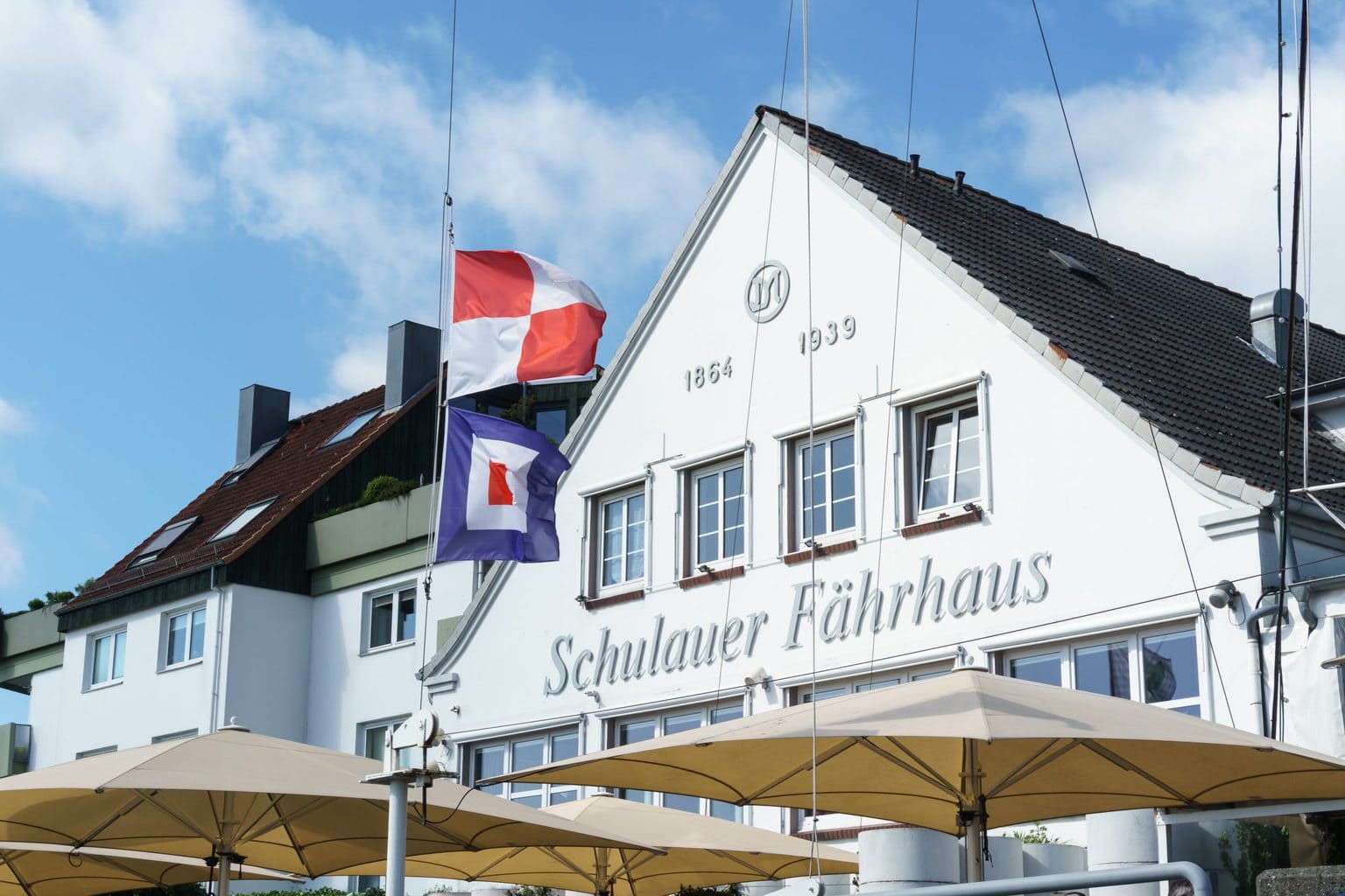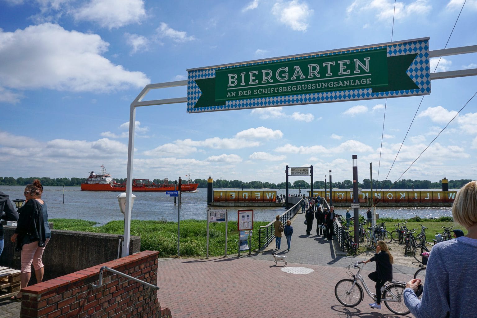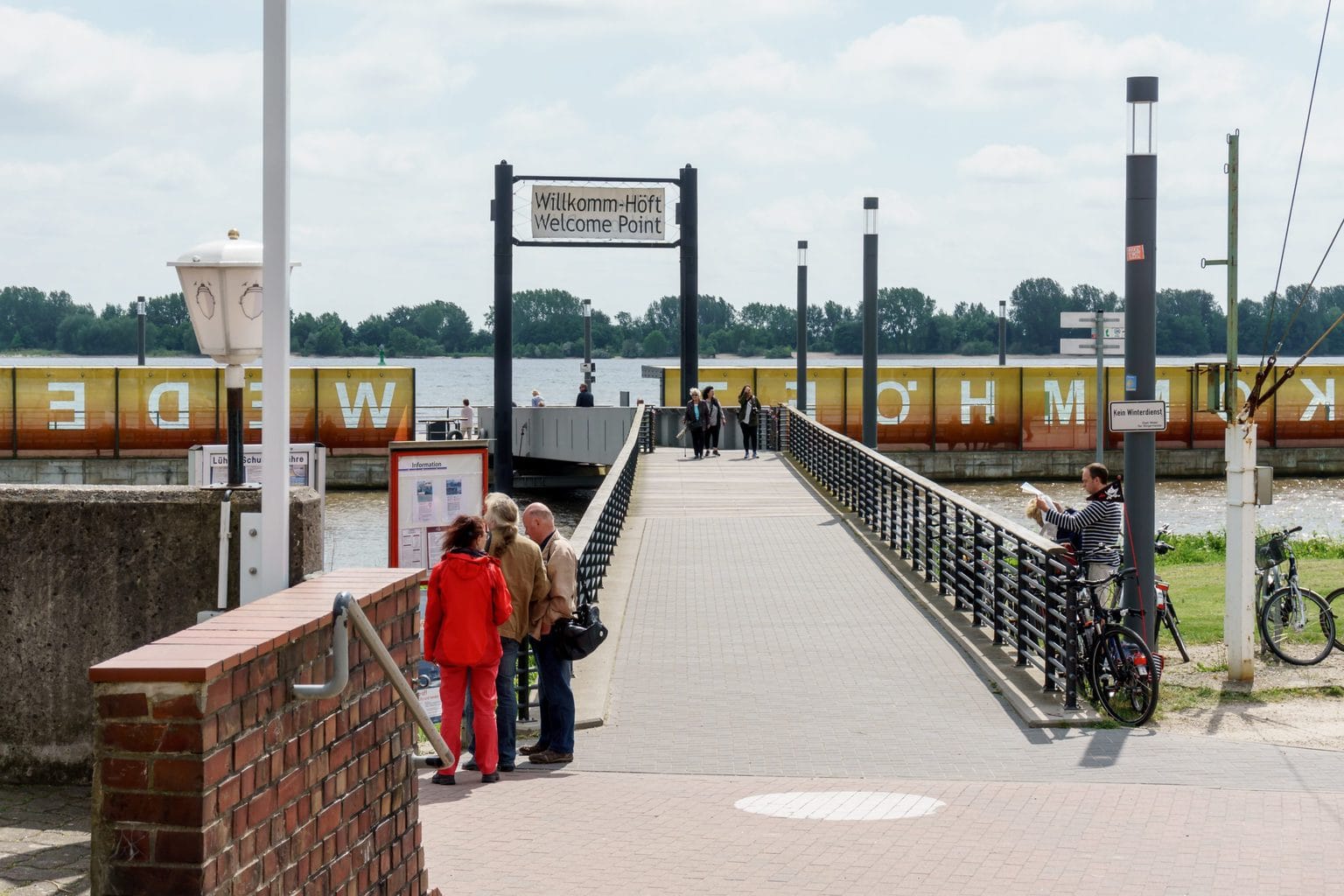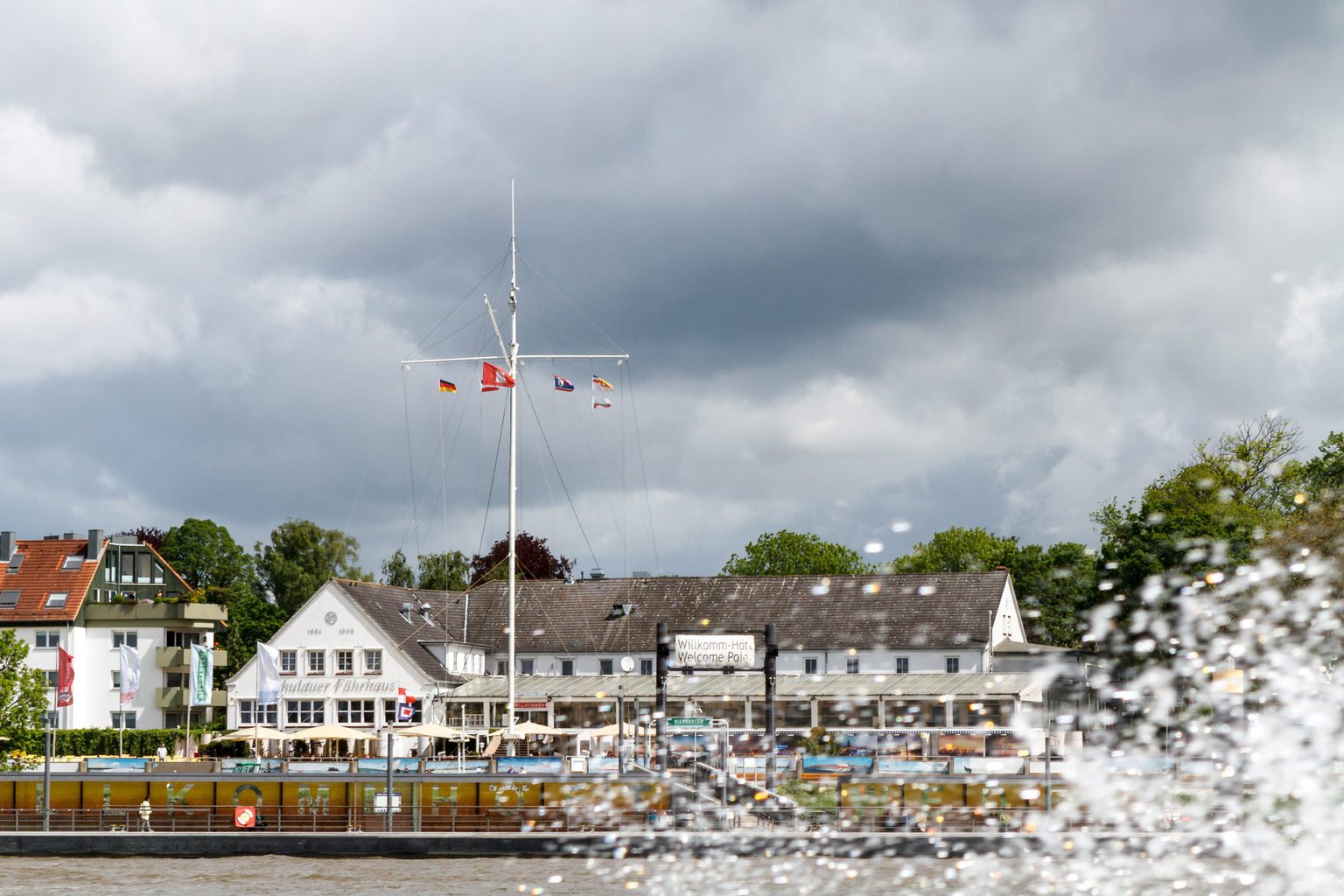 Kurz darauf passieren wir die bekannte ‚Schiffsbegrüßungsanlage im Schulauer Fährhaus‚ (Elbe-km 641), die „Willkomm-Höft“.