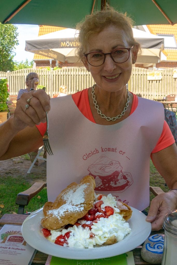 Über Trampelpfade immer an der Südostküste Fehmarns entlang zum „Allee-Cafe Katharinenhof“ mit frei laufenden Hühnern und den bekannten ‚Riesenwindbeuteln‘ – das stand heute auf unserem Plan.
