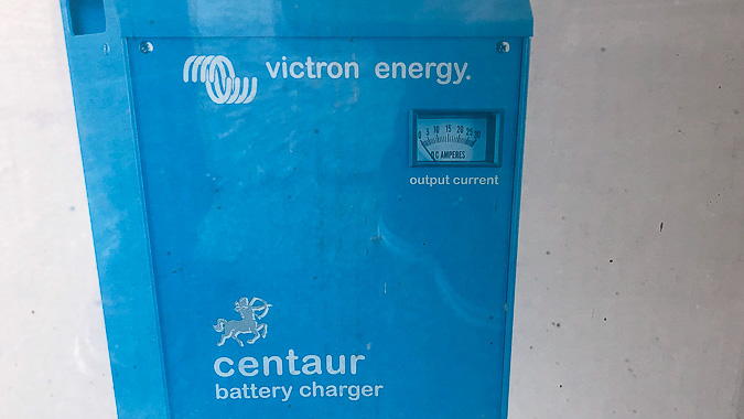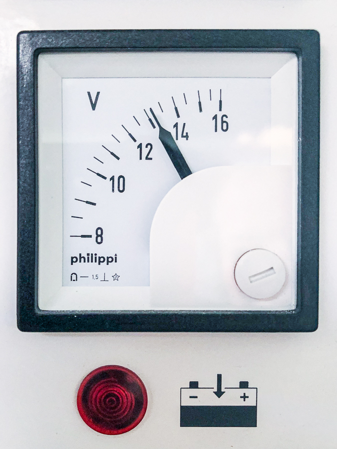 Ein einsames, eingestaubtes Batterieladegerät im Schaufenster der Yachtwerft Augustenborg darf sich jetzt bei uns an Bord austoben und leistet bereits gute Arbeit. Die Kühlschränke kühlen wieder und unsere mitgebrachten Pfälzer Delikatessen bleiben uns zum Glück erhalten.