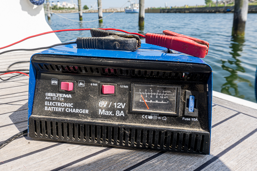 Die ‚Notlösung‘ am Wochenende: ein supernetter dänischer Bootsnachbar organisiert uns sein Autobatterieladegerät für die Übergangszeit.