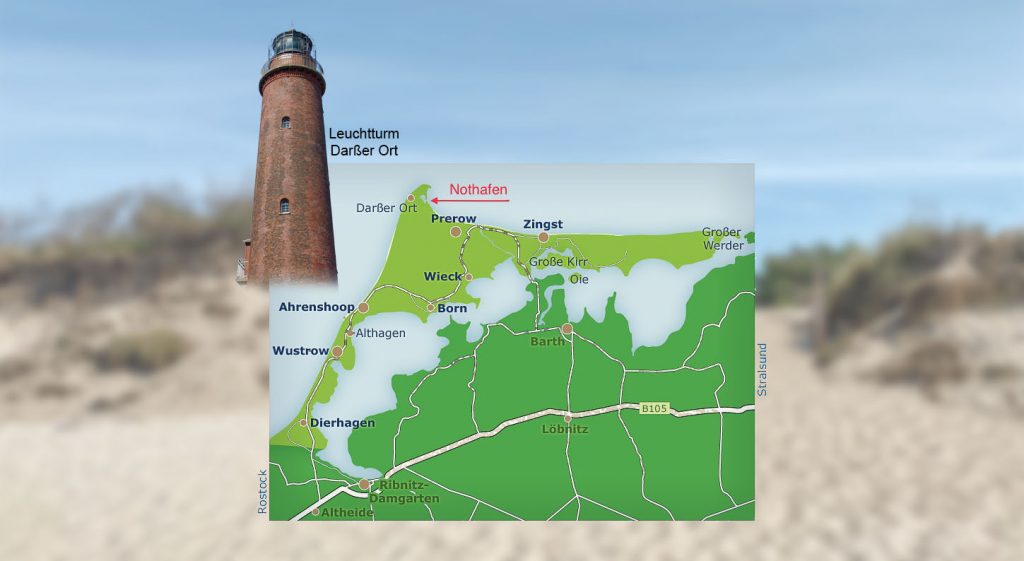 An der Außenseite der Halbinsel Fischland-Darß-Zingst zur Ostsee hin gibt es derzeit keine Häfen. Die Zufahrt zum „Nothafen Darßer Ort“ ist offiziell für Wassersportler gesperrt.