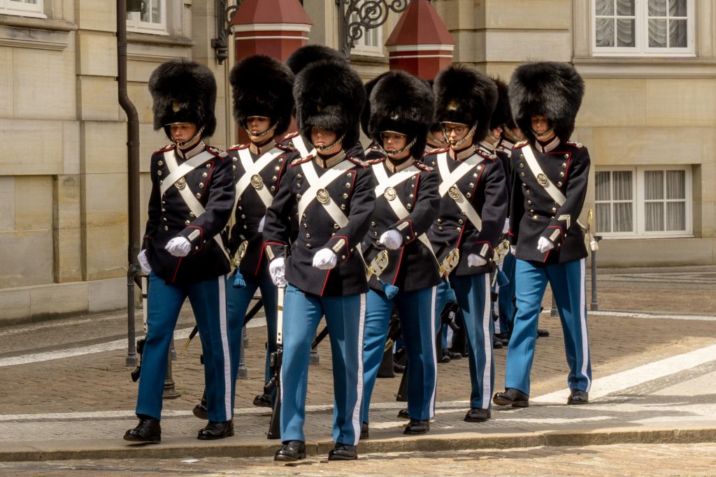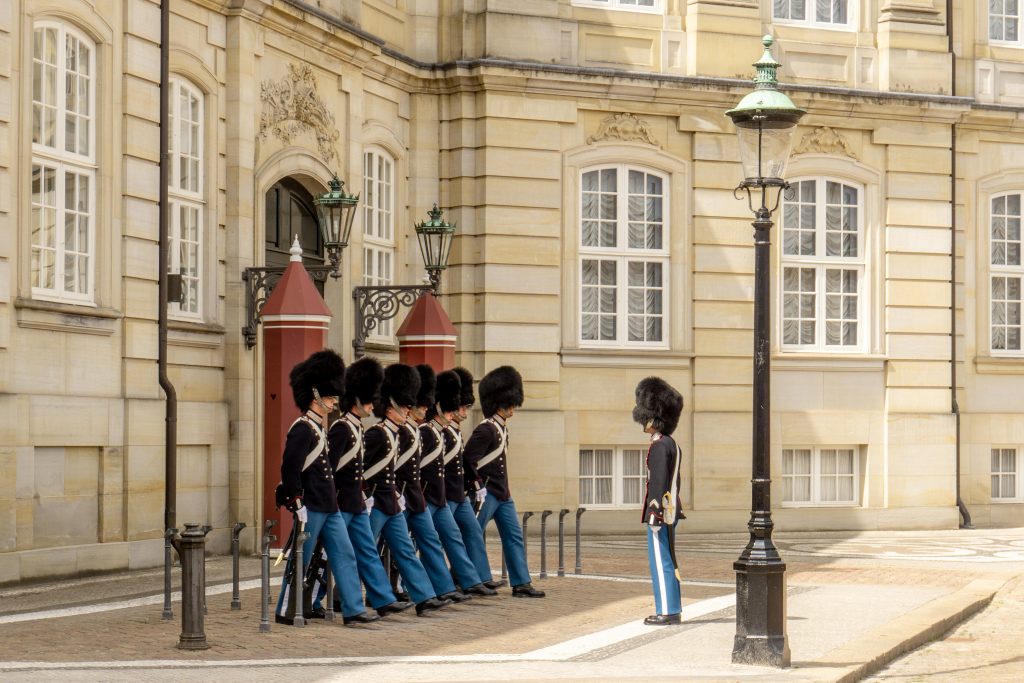 Ein ‚Muss‘: Wachwechsel am Schloss Amalienborg, aber nur die kleine Zeremonie – Königin Margrethe II. ist wohl nicht vor Ort, sondern mit der königlichen Yacht „Dannebrog“ in ihrer Sommerresidenz Sønderborg